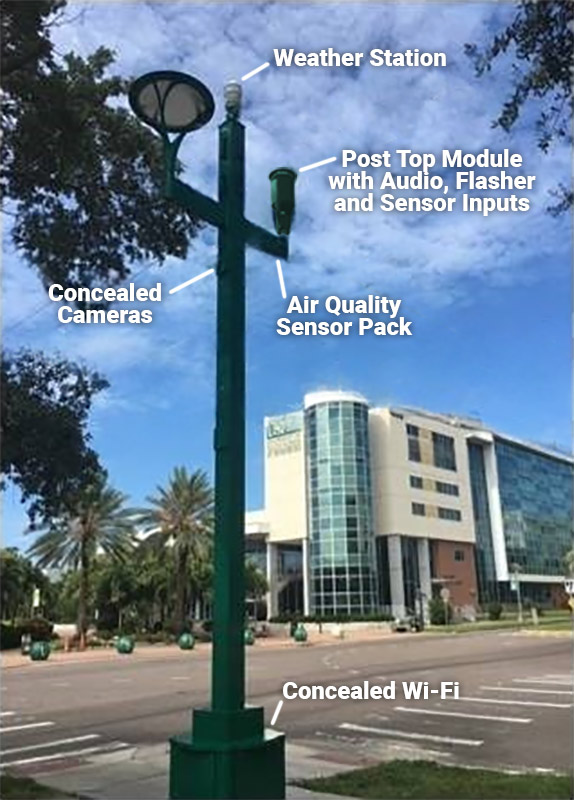 Working closely with faculty, the Intellistreets team developed an Uber Pole that doubles as a real-world curriculum for students studying electronics, networking, and programming. At two campus intersections, the Sensor Fusion System brings multiple technologies together on a single platform, including: